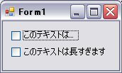 private void Form1_Load(object sender, EventArgs e) { string strMsg = "このテキストは長すぎます"; checkBox1.Text = strMsg; checkBox2.Text = strMsg; checkBox1.AutoSize = false; checkBox1.AutoEllipsis = true; }