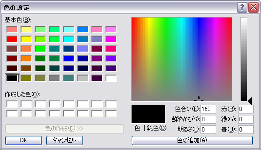 通常、カラーダイアログを開いたときは[色の作成]ボタンを押さないと、色の作成機能部分が表示されません。ダイアログを開くと同時に、色の作成部分も表示するには FullOpen プロパティをtrueにします。