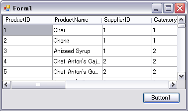 private void Form1_Load(object sender, EventArgs e) { // 1)変数の宣言 System.Data.OleDb.OleDbConnection OleConn = new System.Data.OleDb.OleDbConnection(); System.Data.OleDb.OleDbDataAdapter OleDA; DataSet dtSet = new DataSet("PRODUCTS"); // 2)接続文字列の作成 OleConn.ConnectionString = "Provider=Microsoft.Jet.OLEDB.4.0;" + "Data Source=C:\\Work\\Northwind.mdb;" + "Persist Security Info=False"; // 3)データを取得するためのSQL文を作成する OleDA = new System.Data.OleDb.OleDbDataAdapter("SELECT * FROM PRODUCTS", OleConn); // 4)データセットにデータを取得する OleDA.Fill(dtSet, "PRODUCTS"); // DataGridViewにデータを表示 dataGridView1.DataSource = dtSet.Tables[0]; } private void button1_Click(object sender, EventArgs e) { // 行ヘッダーを非表示にします this.dataGridView1.RowHeadersVisible = false; }