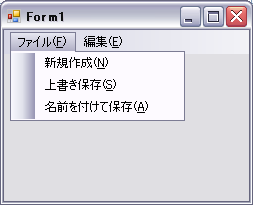階層化されたメニューを作成するには、まず親となるメニュー項目を作成します(サンプルでは[ファイル(F)])。次に子となるメニューを作成し(サンプルでは[新規作成(N)][上書き保存(S)][名前を付けて保存(A)]、親メニューのDropDownItems.Addメソッドを使用します。