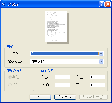 private void button1_Click(object sender, EventArgs e) { System.Drawing.Printing.PageSettings ps = new System.Drawing.Printing.PageSettings(); // ページ設定情報をダイアログにセット pageSetupDialog1.PageSettings = ps; // [印刷の向き]セクションを無効にする pageSetupDialog1.AllowOrientation = false; // PageSetupダイアログを表示する if (pageSetupDialog1.ShowDialog() == DialogResult.OK) { } }