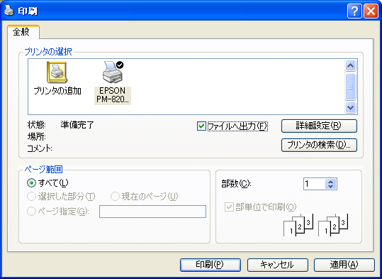 private void button1_Click(object sender, EventArgs e) { System.Drawing.Printing.PrinterSettings ps = new System.Drawing.Printing.PrinterSettings(); // プリンタ設定情報をダイアログにセット printDialog1.PrinterSettings = ps; // PrintDialogを表示する if (printDialog1.ShowDialog() == DialogResult.OK) { if (printDialog1.PrintToFile) MessageBox.Show("ファイルへ出力します"); else MessageBox.Show("印刷します"); } }