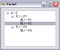 private void Form1_Load(object sender, EventArgs e) { TreeNode rootNode = new TreeNode(); TreeNode childNode1 = new TreeNode(); TreeNode childNode2 = new TreeNode(); TreeNode grandChildNode1 = new TreeNode(); TreeNode grandChildNode2 = new TreeNode(); TreeNode grandChildNode3 = new TreeNode(); //親ノードの作成 rootNode.Text = "ルート"; //子ノードの作成 childNode1.Text = "子ノード1"; childNode2.Text = "子ノード2"; //孫ノードの作成 grandChildNode1.Text = "孫ノード1"; grandChildNode2.Text = "孫ノード2"; grandChildNode3.Text = "孫ノード3"; //孫ノードを親ノードに追加 childNode2.Nodes.Add(grandChildNode3); childNode1.Nodes.Add(grandChildNode1); childNode1.Nodes.Add(grandChildNode2); //子ノードを親ノードに追加 rootNode.Nodes.Add(childNode1); rootNode.Nodes.Add(childNode2); //親ノードをTreeViewに追加 treeView1.Nodes.Add(rootNode); //幅全体を強調表示する treeView1.ShowLines = false; treeView1.FullRowSelect = true; }