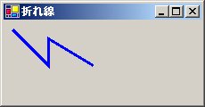 private void Form1_Paint(object sender, PaintEventArgs e) { // グラフィックオブジェクトを取得する Graphics g = e.Graphics; // 折れ線を構成するポジションを作成しておく Point[] points = {new Point(10, 10), new Point(50, 50), new Point(50, 20), new Point(100, 50)}; // Color.Blue, 幅3のペンを作成する Pen BluePen = new Pen(Color.Blue, 3); // 折れ線を描画する g.DrawLines(BluePen, points); // BluePenを破棄する BluePen.Dispose(); // Graphicsオブジェクト破棄する g.Dispose(); }