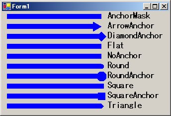 private void Form1_Paint(object sender, PaintEventArgs e) { Pen[] objPen = new Pen[10]; // グラフィックオブジェクトを取得する Graphics g = e.Graphics; for (int i = 0; i < 10; i++) { objPen[i] = new Pen(Brushes.Blue, 10); } objPen[0].EndCap = System.Drawing.Drawing2D.LineCap.AnchorMask; objPen[1].EndCap = System.Drawing.Drawing2D.LineCap.ArrowAnchor; objPen[2].EndCap = System.Drawing.Drawing2D.LineCap.DiamondAnchor; objPen[3].EndCap = System.Drawing.Drawing2D.LineCap.Flat; objPen[4].EndCap = System.Drawing.Drawing2D.LineCap.NoAnchor; objPen[5].EndCap = System.Drawing.Drawing2D.LineCap.Round; objPen[6].EndCap = System.Drawing.Drawing2D.LineCap.RoundAnchor; objPen[7].EndCap = System.Drawing.Drawing2D.LineCap.Square; objPen[8].EndCap = System.Drawing.Drawing2D.LineCap.SquareAnchor; objPen[9].EndCap = System.Drawing.Drawing2D.LineCap.Triangle; for (int i = 0; i < 10; i++) { g.DrawLine(objPen[i], 10, 10 + 20 * i, 200, 10 + 20 * i); objPen[i].Dispose(); } // Graphicsオブジェクト破棄する g.Dispose(); }