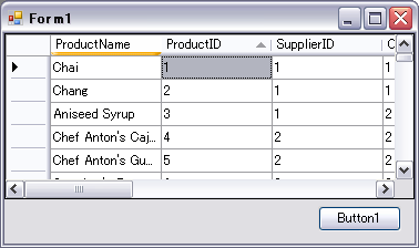 Private Sub Form1_Load(ByVal sender As System.Object, ByVal e As System.EventArgs) Handles MyBase.Load '1)変数の宣言 Dim OleConn As OleDb.OleDbConnection = New OleDb.OleDbConnection Dim OleDA As OleDb.OleDbDataAdapter Dim dtSet As DataSet = New DataSet("PRODUCTS") '2)接続文字列の作成 OleConn.ConnectionString = _ "Provider=Microsoft.Jet.OLEDB.4.0;" & _ "Data Source=C:\Work\Northwind.mdb;" & _ "Persist Security Info=False" '3)データを取得するためのSQL文を作成する OleDA = New OleDb.OleDbDataAdapter("SELECT * FROM Products", OleConn) '4)データセットにデータを取得する OleDA.Fill(dtSet, "PRODUCTS") 'DataGridViewに表示 DataGridView1.DataSource = dtSet.Tables(0) End Sub Private Sub Button1_Click(ByVal sender As System.Object, ByVal e As System.EventArgs) Handles Button1.Click '列の移動をできるようにする Me.DataGridView1.AllowUserToOrderColumns = True End Sub