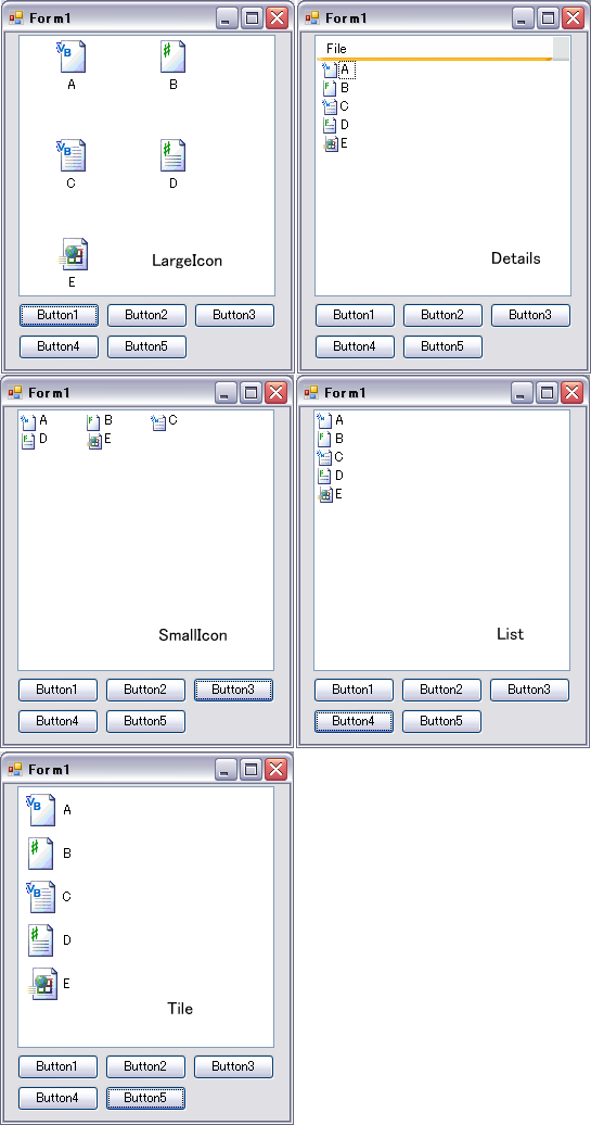 Private Sub Button1_Click(ByVal sender As System.Object, ByVal e As System.EventArgs) Handles Button1.Click 'LargeIcon ListView1.View = View.LargeIcon End Sub Private Sub Button2_Click(ByVal sender As System.Object, ByVal e As System.EventArgs) Handles Button2.Click 'Details ListView1.View = View.Details End Sub Private Sub Button3_Click(ByVal sender As System.Object, ByVal e As System.EventArgs) Handles Button3.Click 'SmallIcon ListView1.View = View.SmallIcon End Sub Private Sub Button4_Click(ByVal sender As System.Object, ByVal e As System.EventArgs) Handles Button4.Click 'List ListView1.View = View.List End Sub Private Sub Button5_Click(ByVal sender As System.Object, ByVal e As System.EventArgs) Handles Button5.Click 'Title ListView1.View = View.Tile End Sub