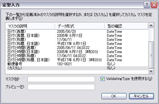 マスクを設定するには、Maskプロパティを使用します。表に示した、1 つ以上のマスク要素で構成される文字列である必要があります。Maskのプロパティ画面を見ると、「郵便番号」「日付時刻」「電話番号」などの標準的なマスクは、あらかじめ用意されています。