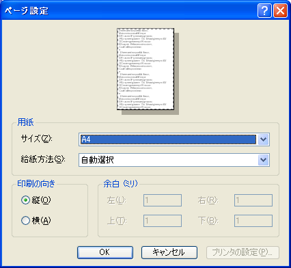 Private Sub Button1_Click(ByVal sender As System.Object, ByVal e As System.EventArgs) Handles Button1.Click Dim ps As New Printing.PageSettings 'ページ設定情報をダイアログにセット PageSetupDialog1.PageSettings = ps '[余白]セクションを無効にする PageSetupDialog1.AllowMargins = False 'PageSetupダイアログを表示する If PageSetupDialog1.ShowDialog = Windows.Forms.DialogResult.OK Then End If End Sub