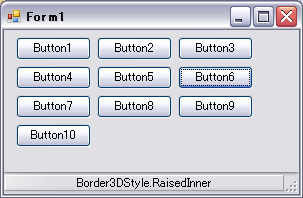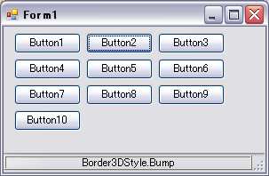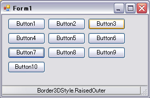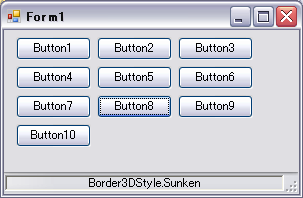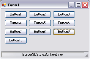 Private Sub Form1_Load(ByVal sender As System.Object, ByVal e As System.EventArgs) Handles MyBase.Load 'すべての側に境界線が表示されるようにする ToolStripStatusLabel1.BorderSides = ToolStripStatusLabelBorderSides.All End Sub Private Sub Button1_Click(ByVal sender As System.Object, ByVal e As System.EventArgs) Handles Button1.Click '境界線が指定した四角形の外側に描画され、四角形の大きさは保持されます。 ToolStripStatusLabel1.BorderStyle = Border3DStyle.Adjust ToolStripStatusLabel1.Text = "Border3DStyle.Adjust" End Sub Private Sub Button2_Click(ByVal sender As System.Object, ByVal e As System.EventArgs) Handles Button2.Click '境界線の内縁と外縁が、浮き出した状態で表示されます。 ToolStripStatusLabel1.BorderStyle = Border3DStyle.Bump ToolStripStatusLabel1.Text = "Border3DStyle.Bump" End Sub Private Sub Button3_Click(ByVal sender As System.Object, ByVal e As System.EventArgs) Handles Button3.Click '境界線の内縁と外縁が、くぼんだ状態で表示されます。 ToolStripStatusLabel1.BorderStyle = Border3DStyle.Etched ToolStripStatusLabel1.Text = "Border3DStyle.Etched" End Sub Private Sub Button4_Click(ByVal sender As System.Object, ByVal e As System.EventArgs) Handles Button4.Click '境界線に 3D スタイルは適用されません。 ToolStripStatusLabel1.BorderStyle = Border3DStyle.Flat ToolStripStatusLabel1.Text = "Border3DStyle.Flat" End Sub Private Sub Button5_Click(ByVal sender As System.Object, ByVal e As System.EventArgs) Handles Button5.Click '境界線の内縁と外縁が、浮き出して表示されます。 ToolStripStatusLabel1.BorderStyle = Border3DStyle.Raised ToolStripStatusLabel1.Text = "Border3DStyle.Raised" End Sub Private Sub Button6_Click(ByVal sender As System.Object, ByVal e As System.EventArgs) Handles Button6.Click '境界線の内縁だけが浮き出して表示され、外縁は表示されません。 ToolStripStatusLabel1.BorderStyle = Border3DStyle.RaisedInner ToolStripStatusLabel1.Text = "Border3DStyle.RaisedInner" End Sub Private Sub Button7_Click(ByVal sender As System.Object, ByVal e As System.EventArgs) Handles Button7.Click '境界線の外縁だけが浮き出して表示され、内縁は表示されません。 ToolStripStatusLabel1.BorderStyle = Border3DStyle.RaisedOuter ToolStripStatusLabel1.Text = "Border3DStyle.RaisedOuter" End Sub Private Sub Button8_Click(ByVal sender As System.Object, ByVal e As System.EventArgs) Handles Button8.Click '境界線の内縁と外縁が、くぼんで表示されます。 ToolStripStatusLabel1.BorderStyle = Border3DStyle.Sunken ToolStripStatusLabel1.Text = "Border3DStyle.Sunken" End Sub Private Sub Button9_Click(ByVal sender As System.Object, ByVal e As System.EventArgs) Handles Button9.Click '境界線の内縁だけがくぼんで表示され、外縁は表示されません。 ToolStripStatusLabel1.BorderStyle = Border3DStyle.SunkenInner ToolStripStatusLabel1.Text = "Border3DStyle.SunkenInner" End Sub Private Sub Button10_Click(ByVal sender As System.Object, ByVal e As System.EventArgs) Handles Button10.Click '境界線の外縁だけがくぼんで表示され、内縁は表示されません。 ToolStripStatusLabel1.BorderStyle = Border3DStyle.SunkenOuter ToolStripStatusLabel1.Text = "Border3DStyle.SunkenOuter" End Sub