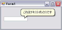 Private toolTipMsg As New ToolTip Private Sub Form1_Load(ByVal sender As System.Object, ByVal e As System.EventArgs) Handles MyBase.Load 'TextBox1にツールチップを表示するように設定する toolTipMsg.SetToolTip(TextBox1, "これはテキストボックスです") 'ツールヒントにバルーンウィンドウを使用する toolTipMsg.IsBalloon = True End Sub